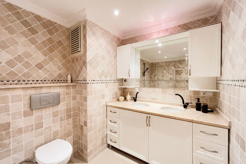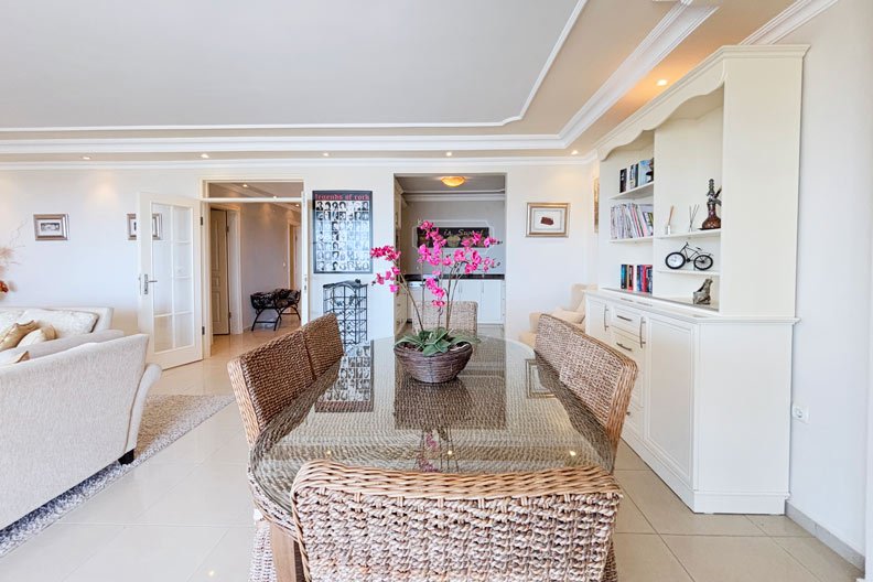 Dieses atemberaubende Anwesen bietet 300 m² wunderschön gestaltete Wohnfläche und einen herrlichen Blick über zwei Ebenen. Die moderne Einrichtung, die Möbel und die Kunstwerke vermitteln ein angenehmes, entspannendes Ambiente. Der zentrale Wohnbereich ist ein geräumiges und einladendes Wohnzimmer mit großem Essbereich und großen Schiebetüren, die auf eine breite, geschwungene Terrasse führen – ideal für gesellige Stunden oder zum Entspannen im Schatten. Im hinteren Bereich des Wohnzimmers befindet sich ein Durchgang zur teilweise separaten modernen Küche. Auf dieser unteren Ebene befinden sich außerdem ein langer Flur, ein Hauswirtschaftsraum, zwei schöne Doppelschlafzimmer und ein Familienbadezimmer.