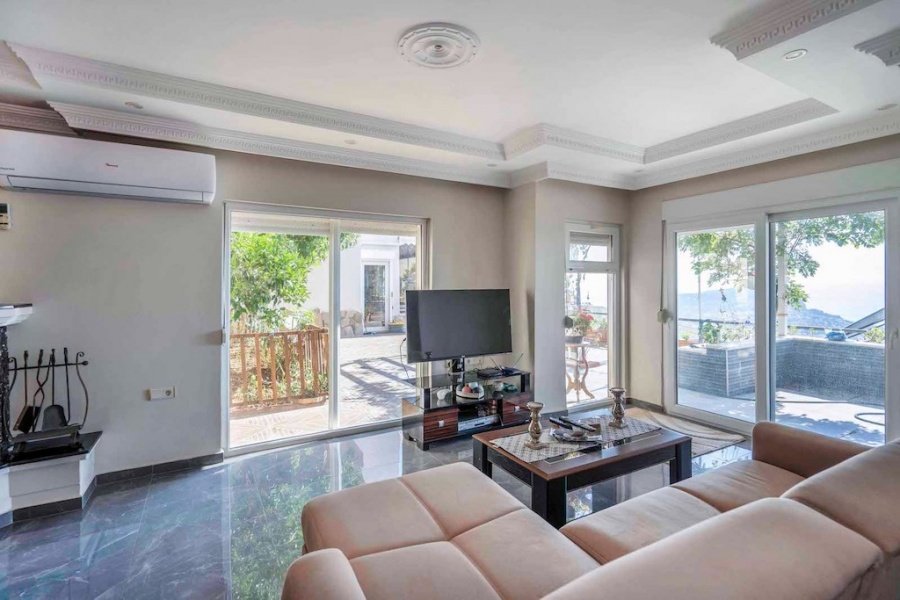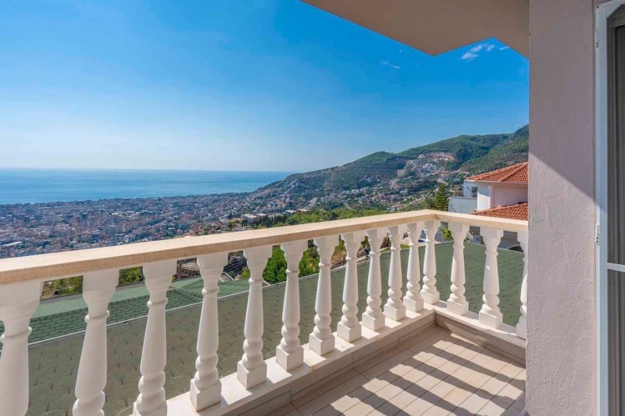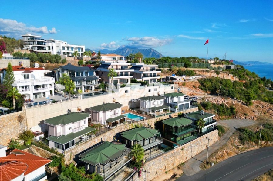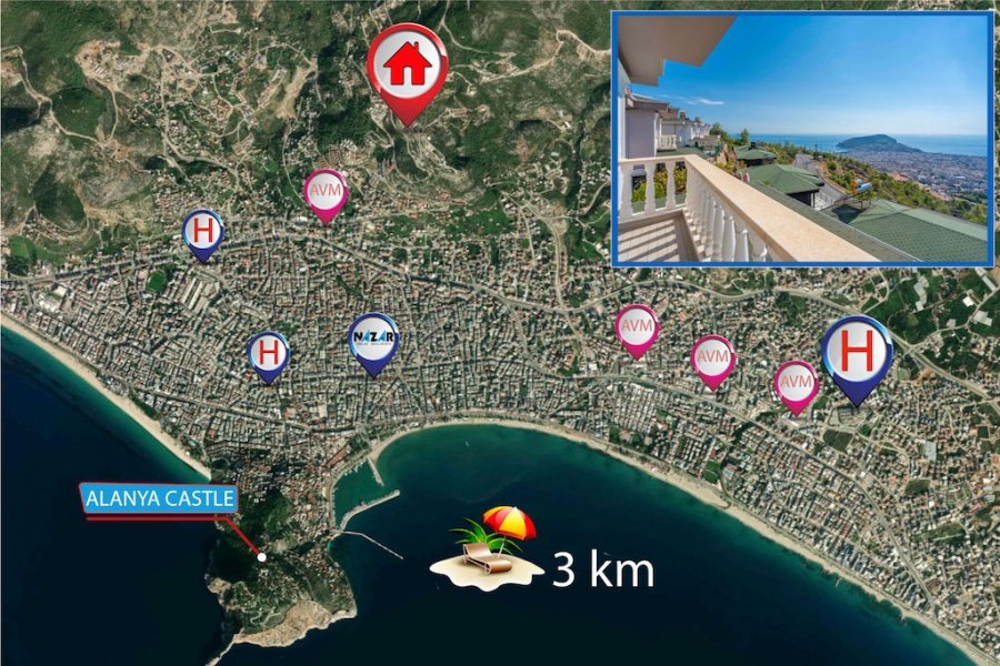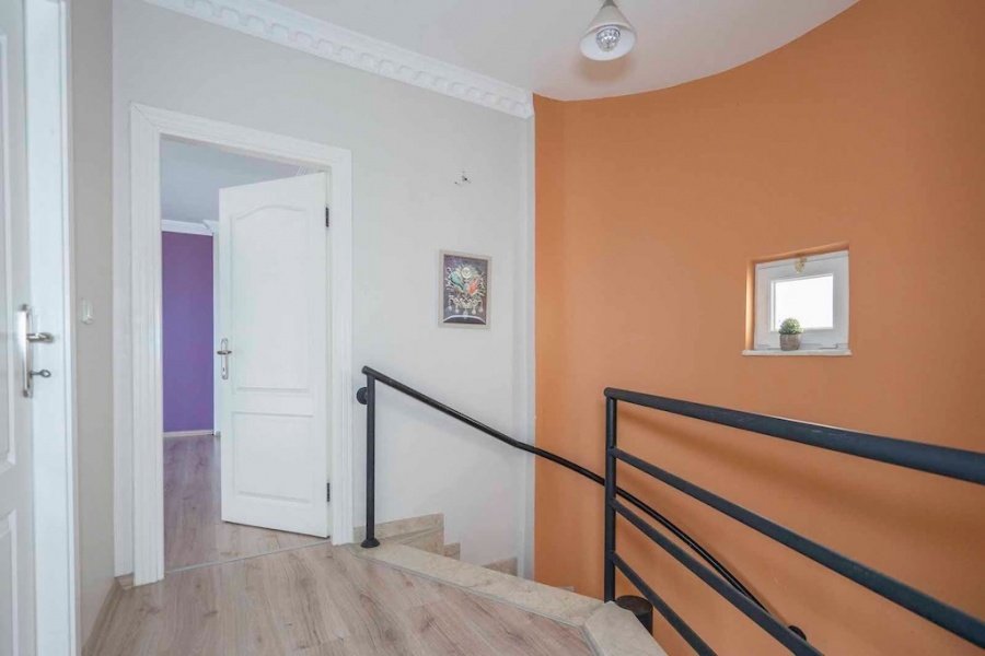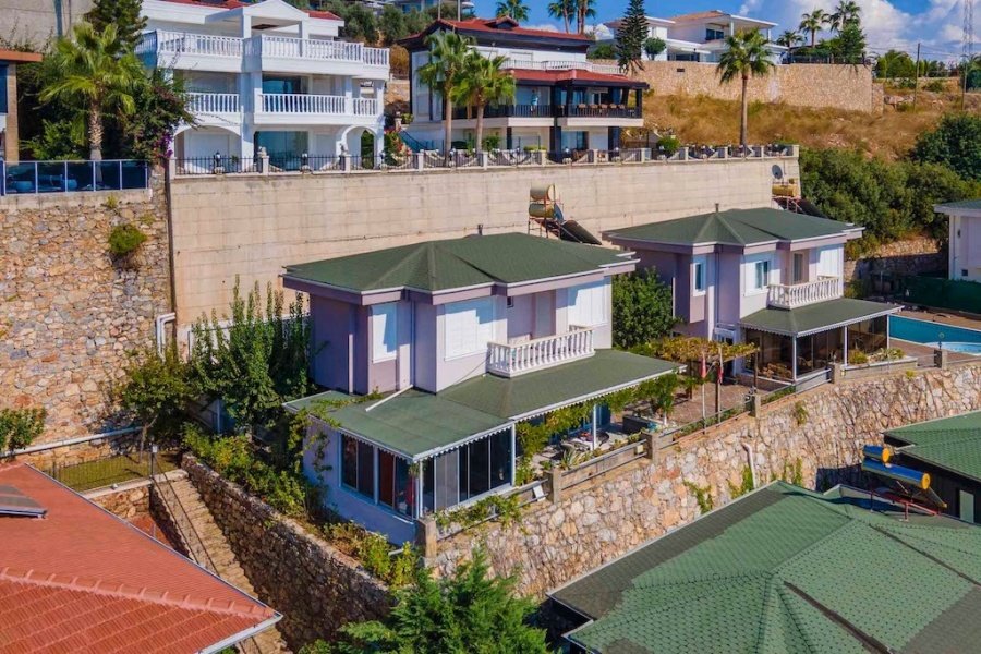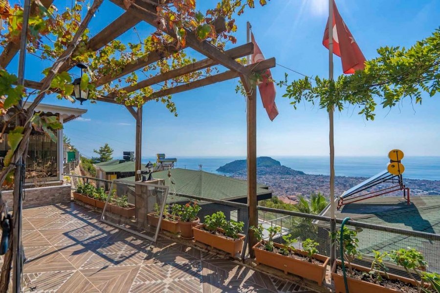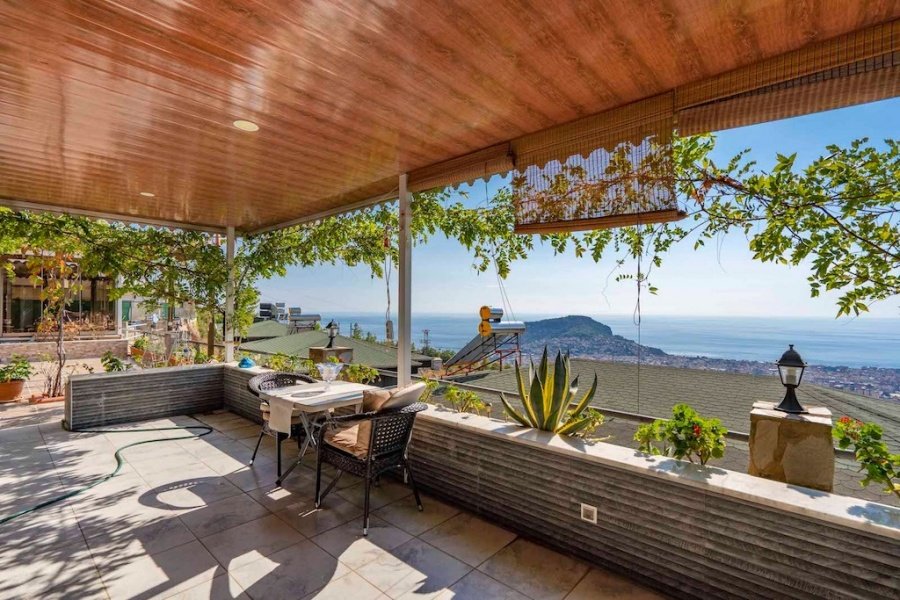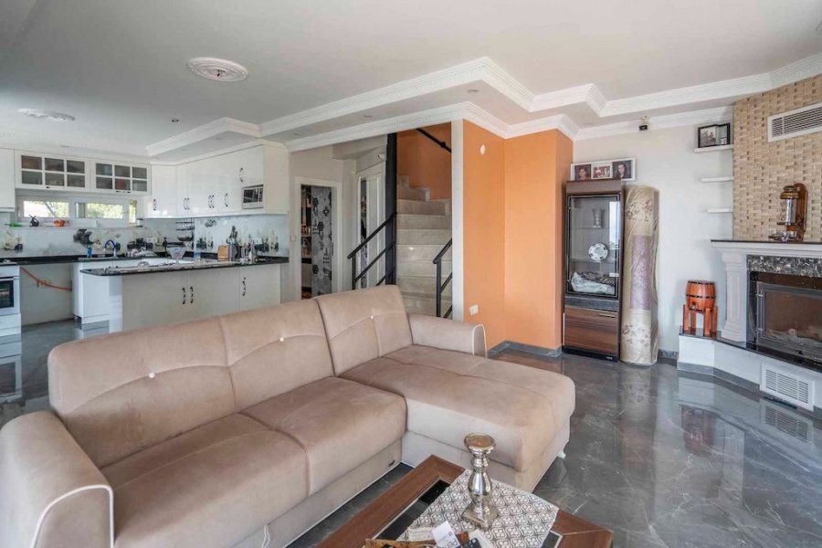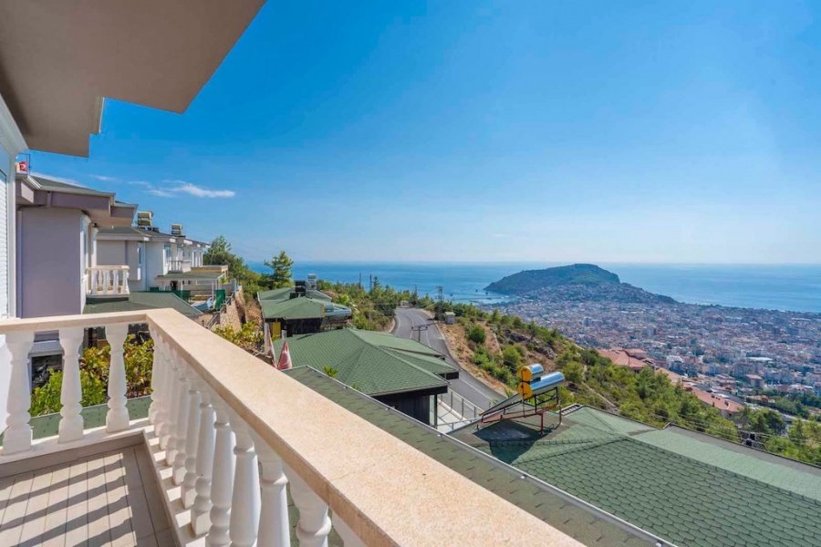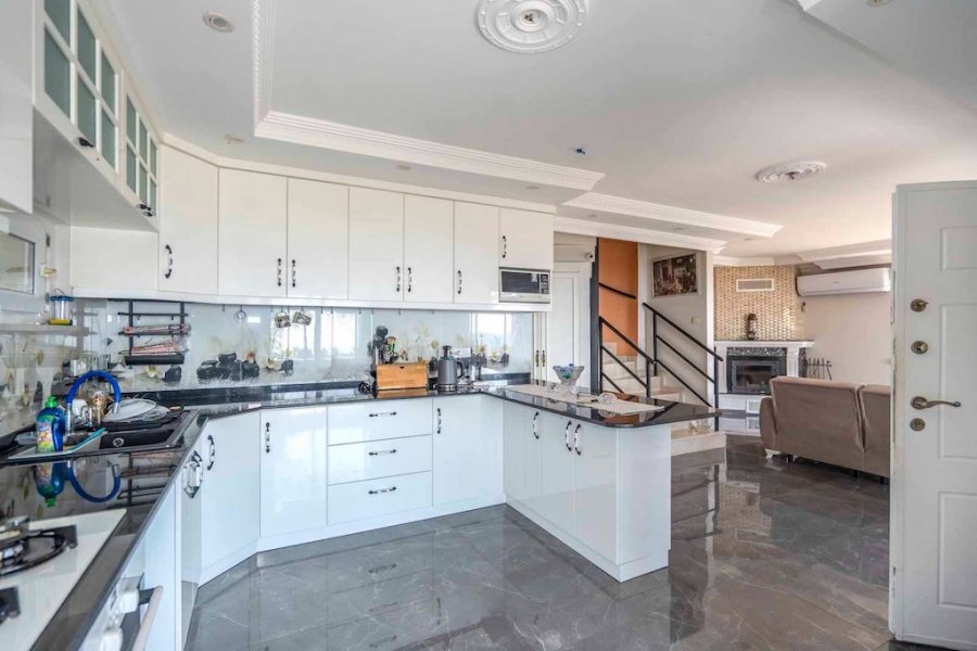 Alanya’nın Bektaş Mahallesi’nde, göz kamaştırıcı deniz, kale ve şehir manzarasına hakim konumda yer alan bu lüks 3+1 villa, modern ve şık eşyalarıyla satılıktır. 150 m² arsa üzerinde konumlanan villa, 135 m² oturum alanına sahiptir. Geniş açık mutfaklı salon, şömineli oturma alanı, 3 yatak odası, ebeveyn banyosu, kiler, balkon, banyo ve WC ile fonksiyonel bir yaşam sunar.